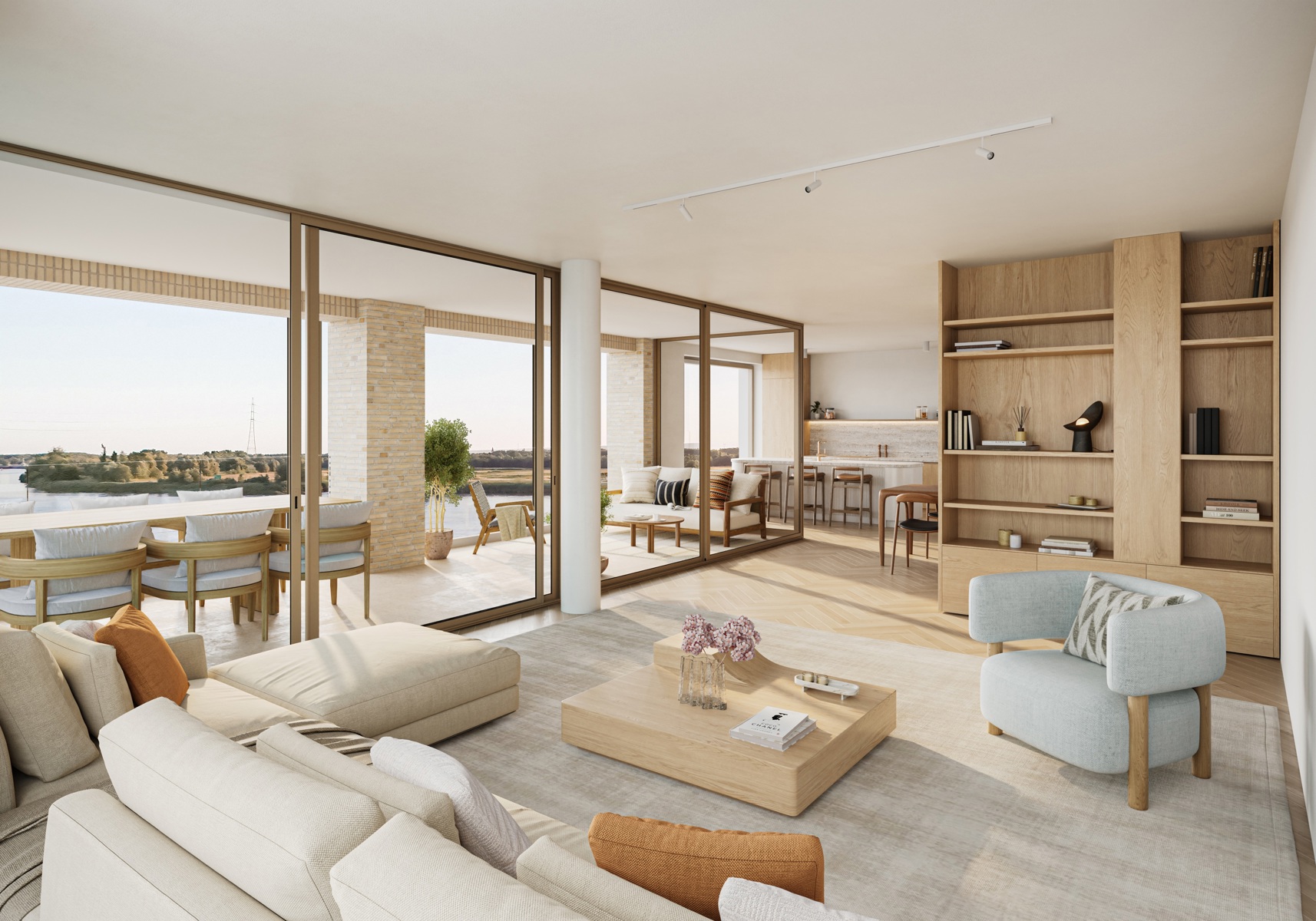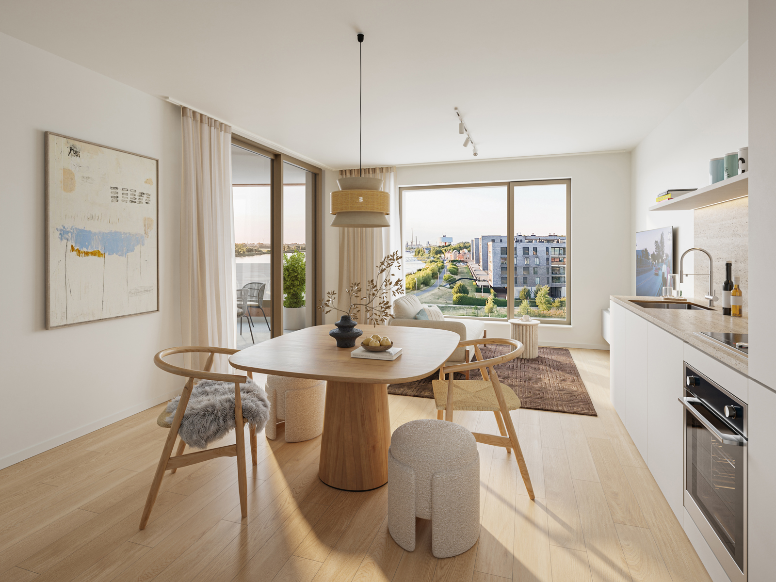 De moderne appartementen met 1, 2 of 3 slaapkamers bieden een schitterend uitzicht op de Schelde of het park. Dankzij de grote ramen en ruime terrassen lopen binnen en buiten moeiteloos in elkaar over – perfect om te genieten van het zonlicht, het panorama en de rust van de natuur.