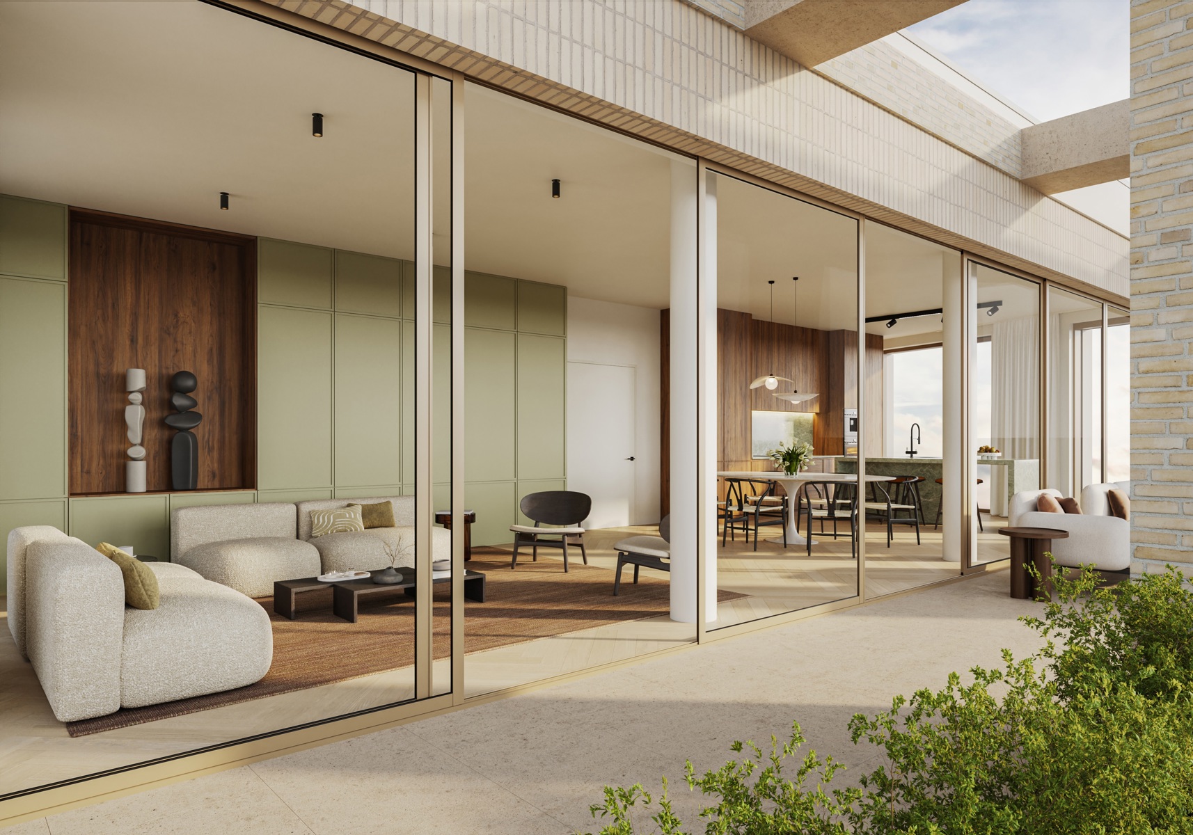 De moderne appartementen met 1, 2 of 3 slaapkamers bieden een schitterend uitzicht op de Schelde of het park. Dankzij de grote ramen en ruime terrassen lopen binnen en buiten moeiteloos in elkaar over – perfect om te genieten van het zonlicht, het panorama en de rust van de natuur.