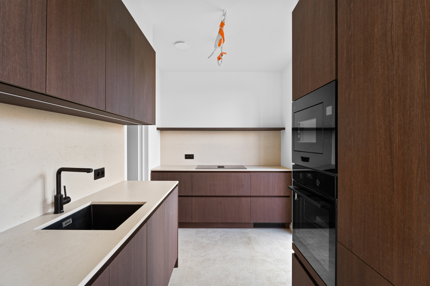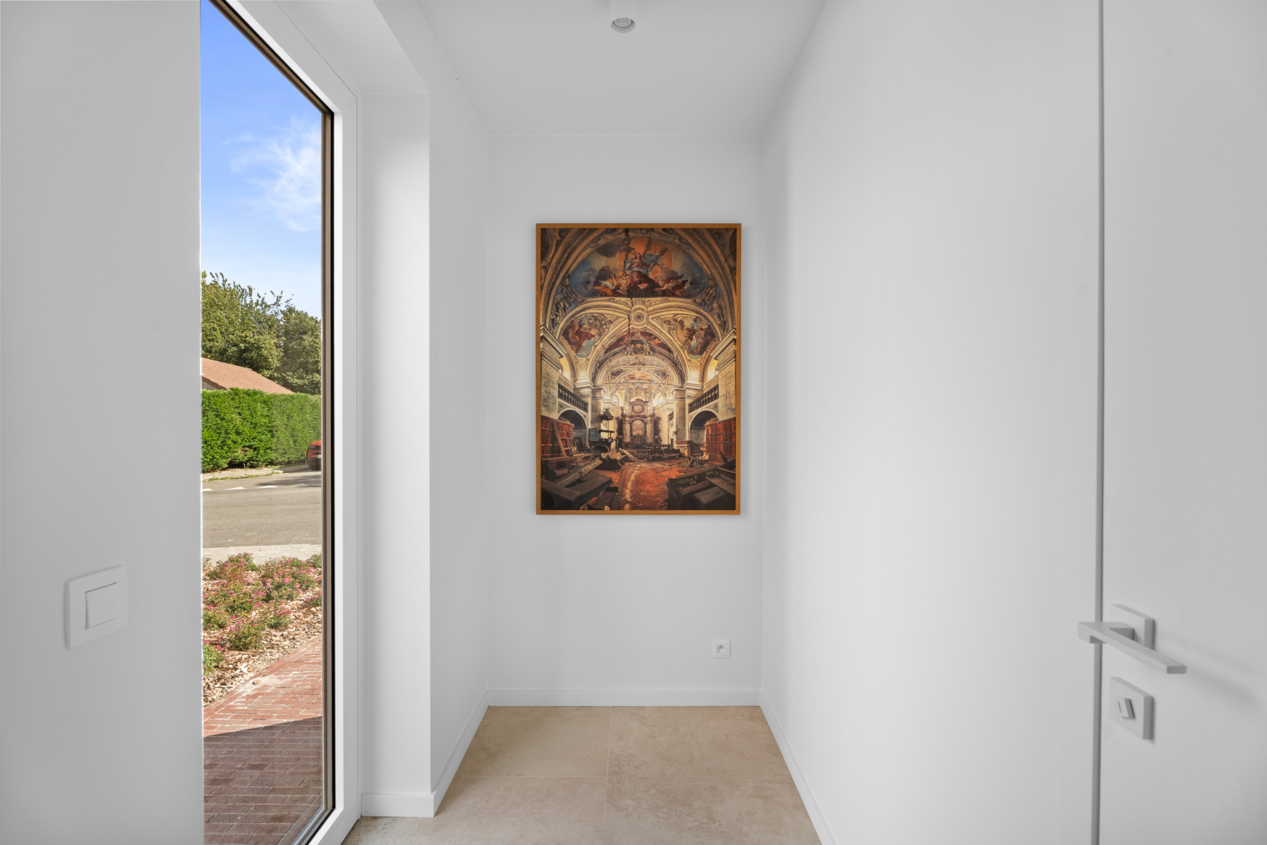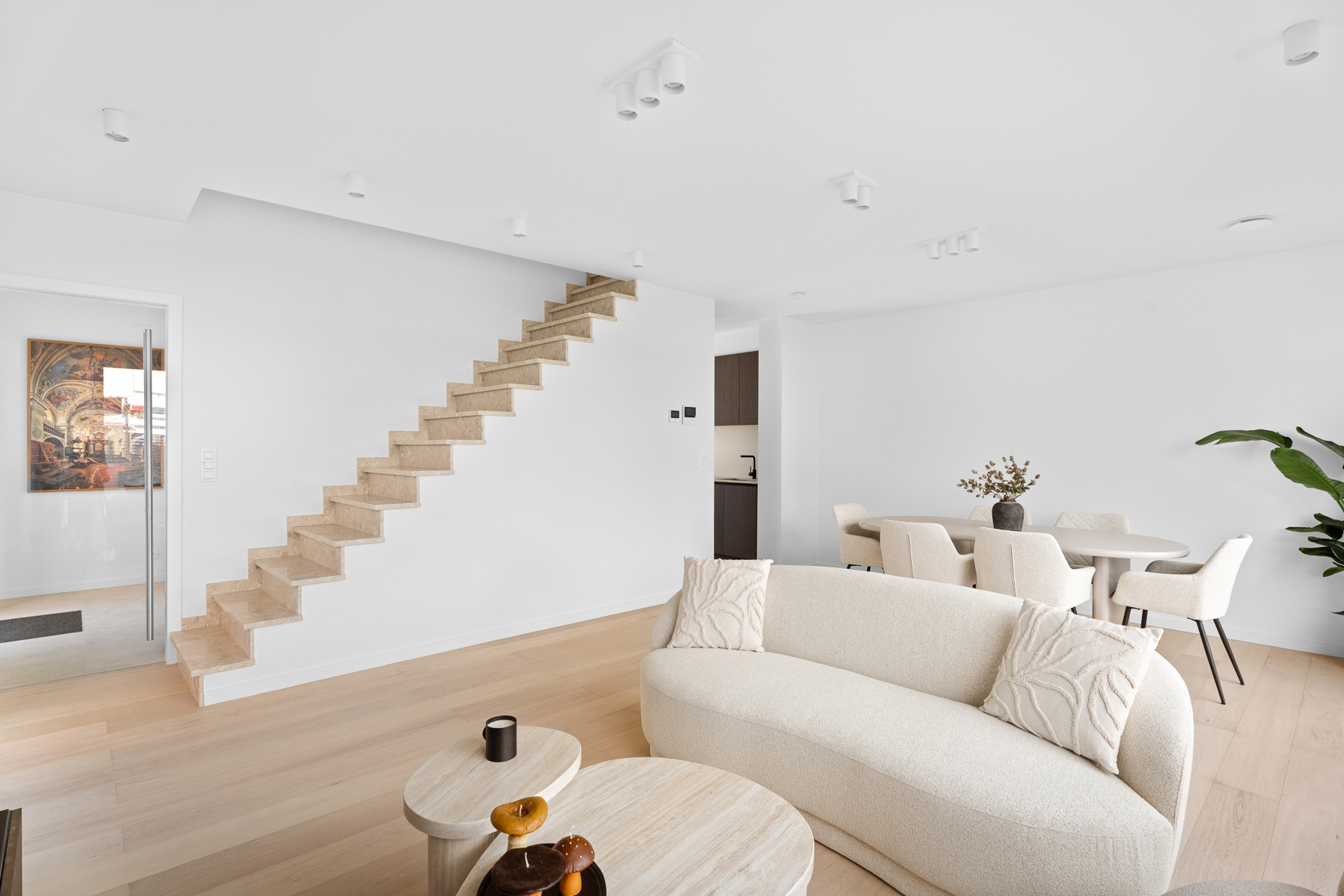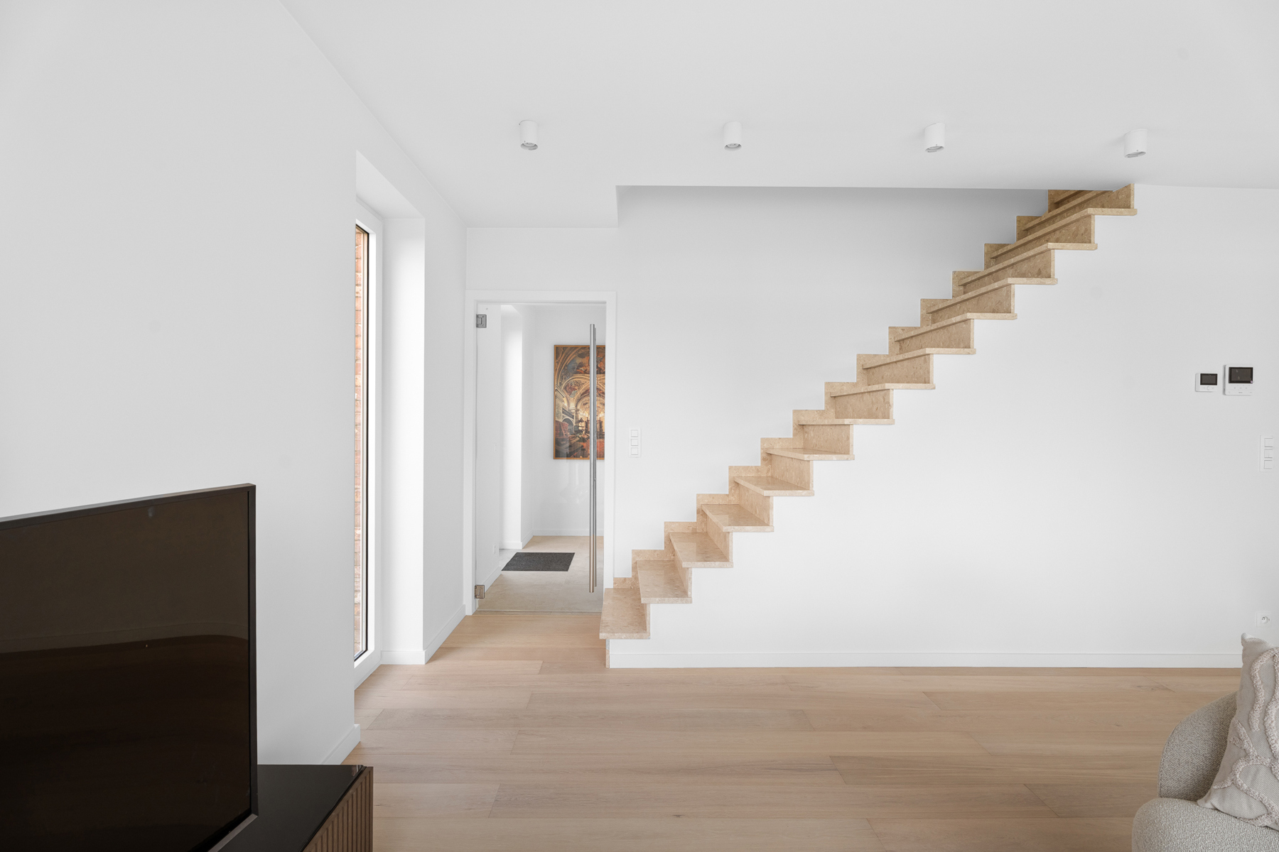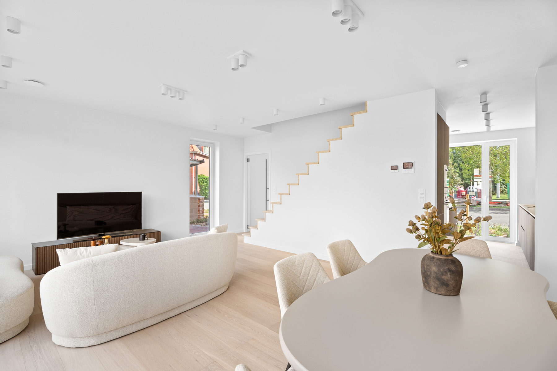 Binnenin wacht je een slimme indeling die functionaliteit koppelt aan elegantie. De inkomhal met gastentoilet en berging leidt je naar een hoogwaardige keuken, strak afgewerkt en voorzien van alle moderne toestellen. De gezellige woonruimte met grote raampartijen brengt veel licht en een prachtig zicht op de tuin.