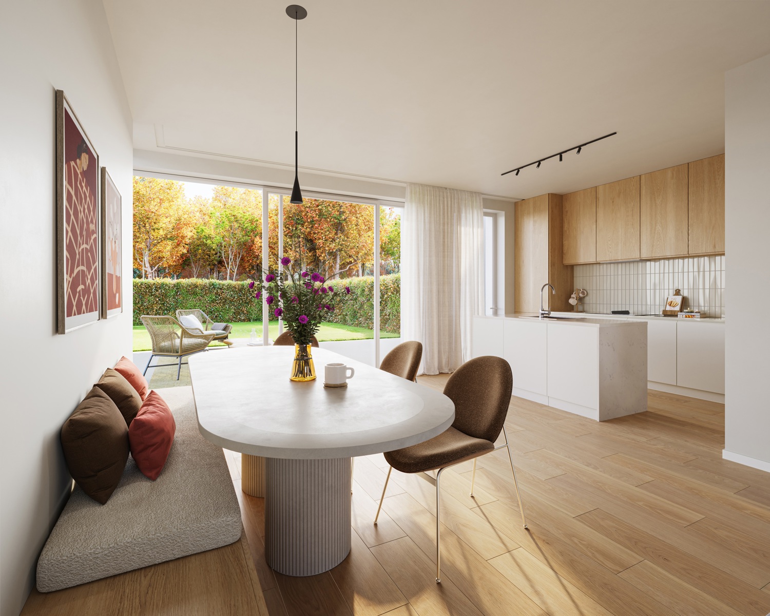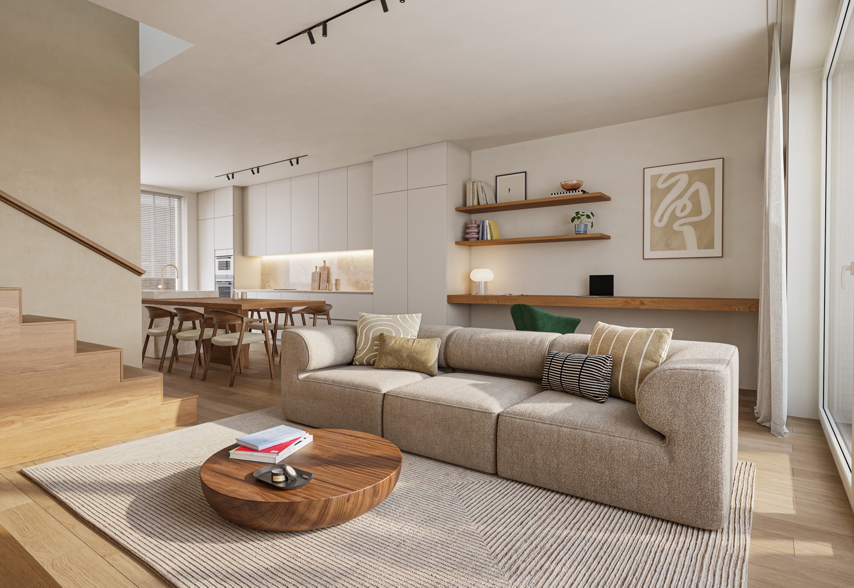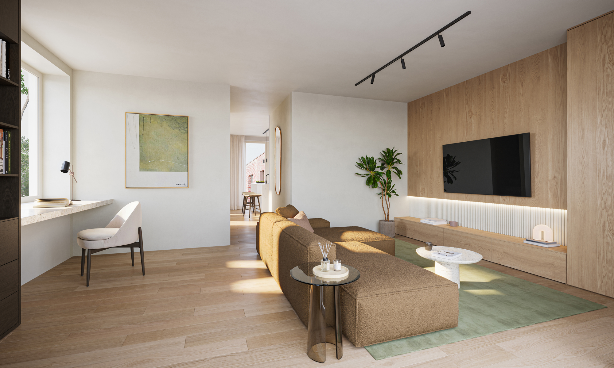Binnenin Park aan de Stroom draait alles om licht, ruimte en leefkwaliteit. Elk appartement en elke woning is ontworpen met oog voor detail en met materialen van de hoogste kwaliteit. Het resultaat? Een interieur dat rust uitstraalt, uitnodigt en moeiteloos aansluit bij jouw levensstijl. De grote ramen zorgen voor overvloedig daglicht en een open gevoel, terwijl de doordachte indeling elke vierkante meter optimaal benut. De natuurlijke kleuren en warme afwerkingen brengen harmonie en evenwicht, met een subtiele link naar de groene omgeving buiten.